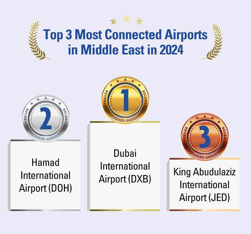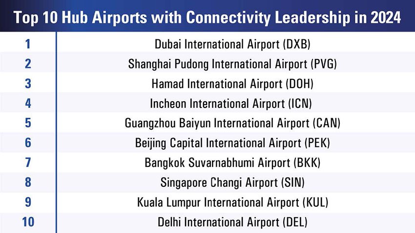 Dubai International Airport emerged as the top hub, followed by Shanghai Pudong International Airport and Hamad International Airport.