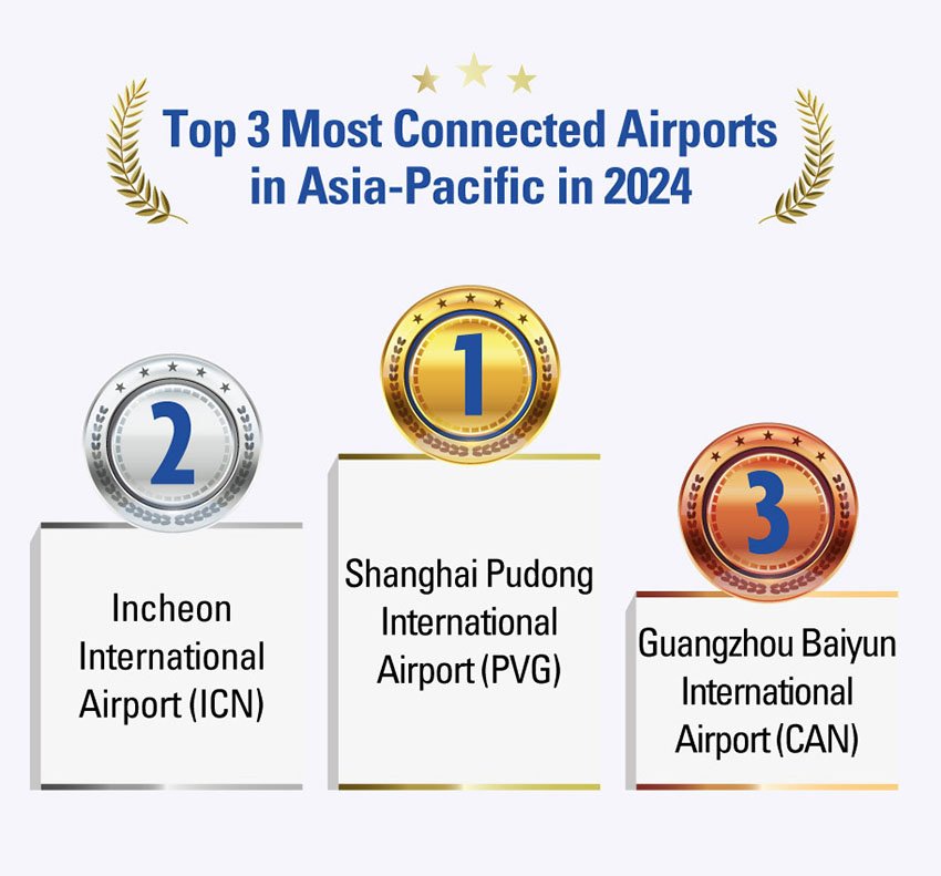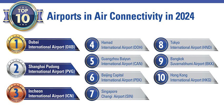 - Airports in Asia-Pacific and the Middle East experienced across-the-board connectivity growth in 2024, driven by China’s reopening and route expansions.
